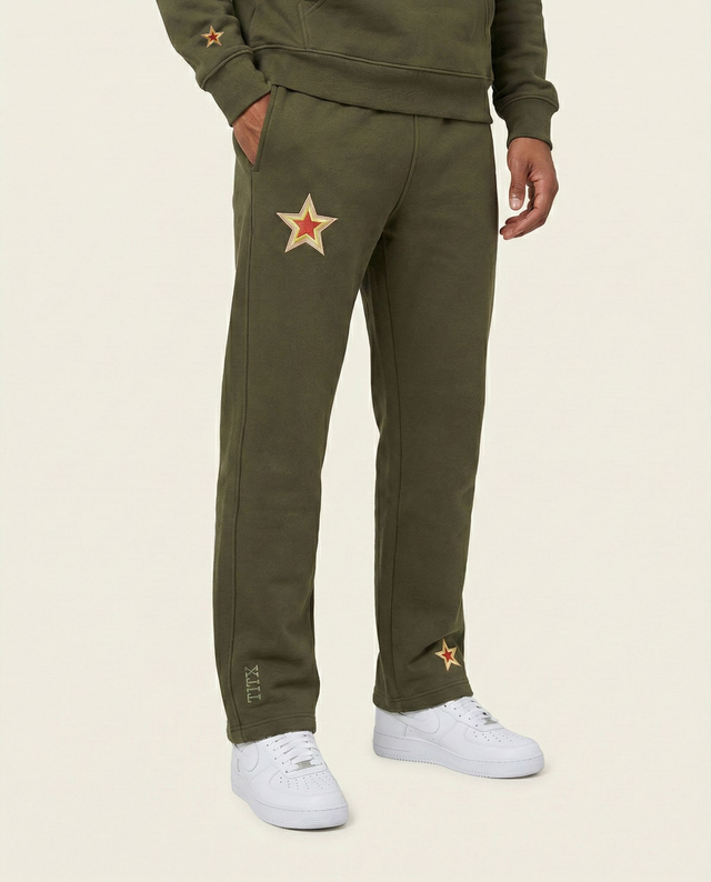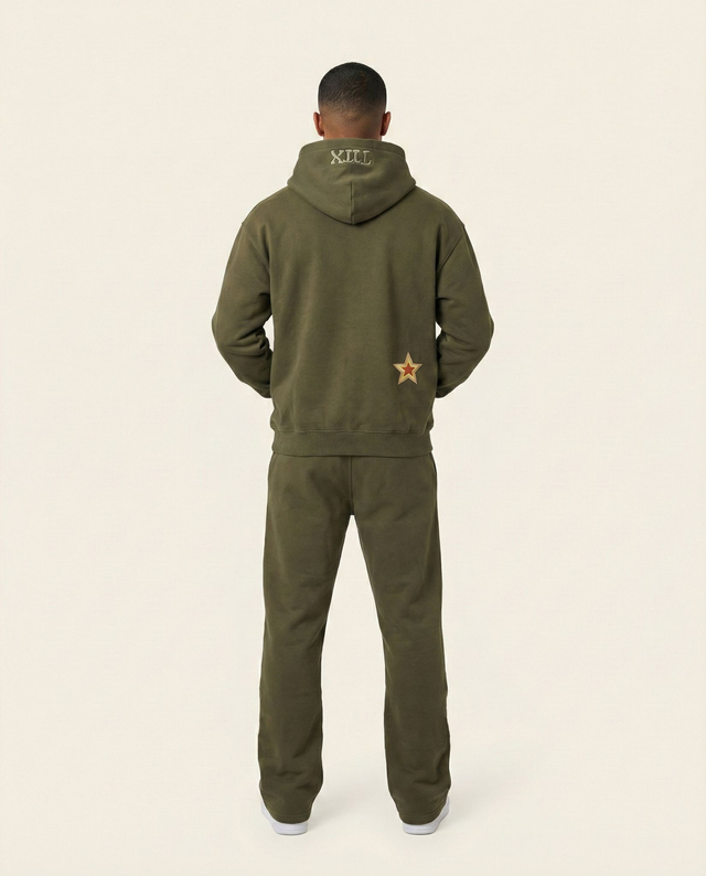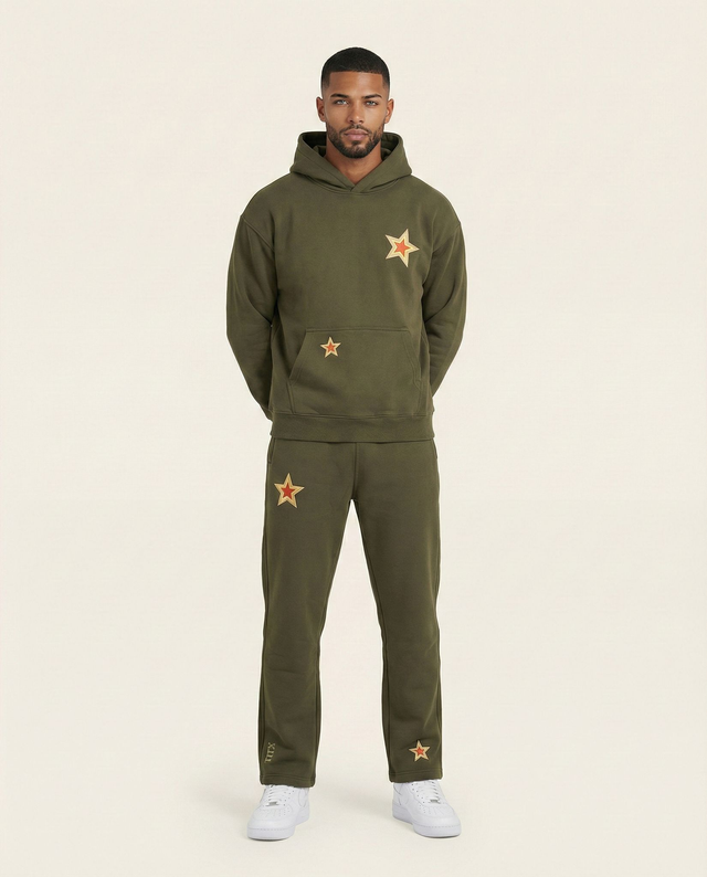 360 grammes de coton peigné : une matière dense, faite pour durer. Sur le vert kaki, une pluie d’étoiles brodées, tricolores, comme une signature qui n’appartient qu’à toi. Une pièce lourde, visuellement et symboliquement.