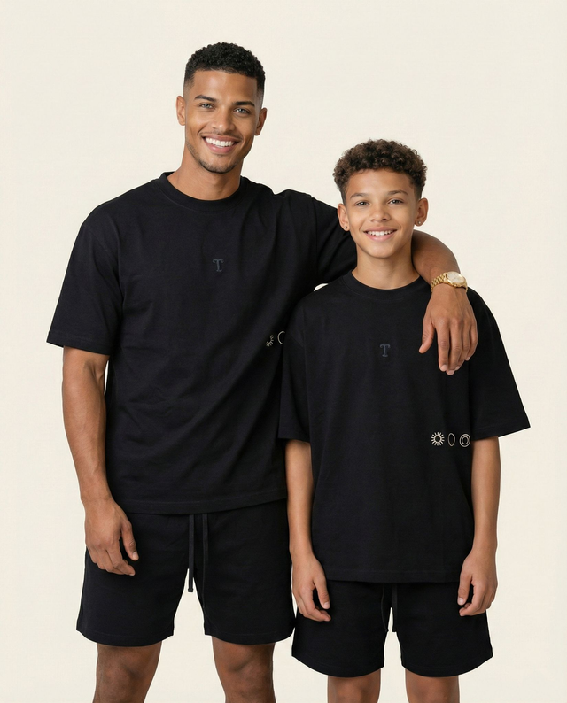 T-shirt en jersey 100 % coton – 230gsm. Coupe oversized avec tombé droit. Short en coton - 260gsm. Broderie sous la poitrine gauche avec les trois symboles de la collection : le soleil (énergie), le cercle (équilibre), les deux cercles (connexion). Un ensemble pensé pour la période estivale.